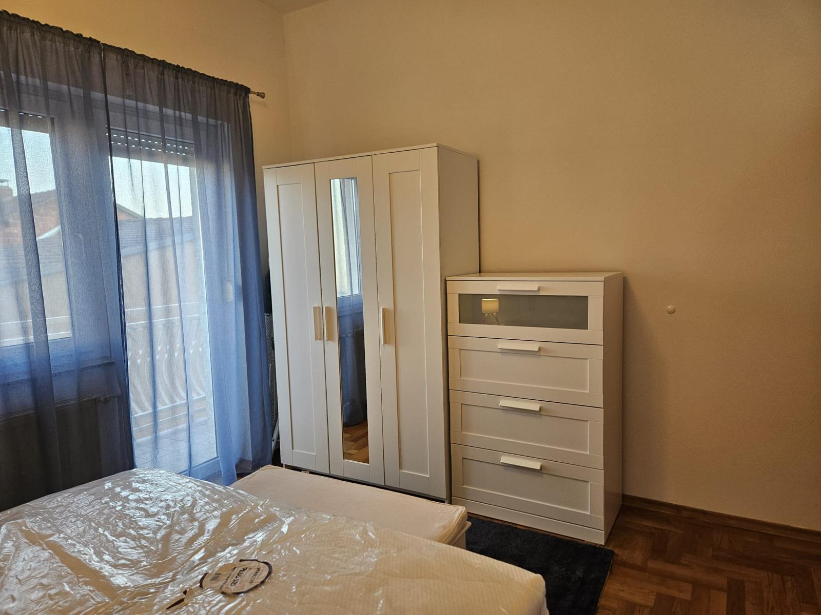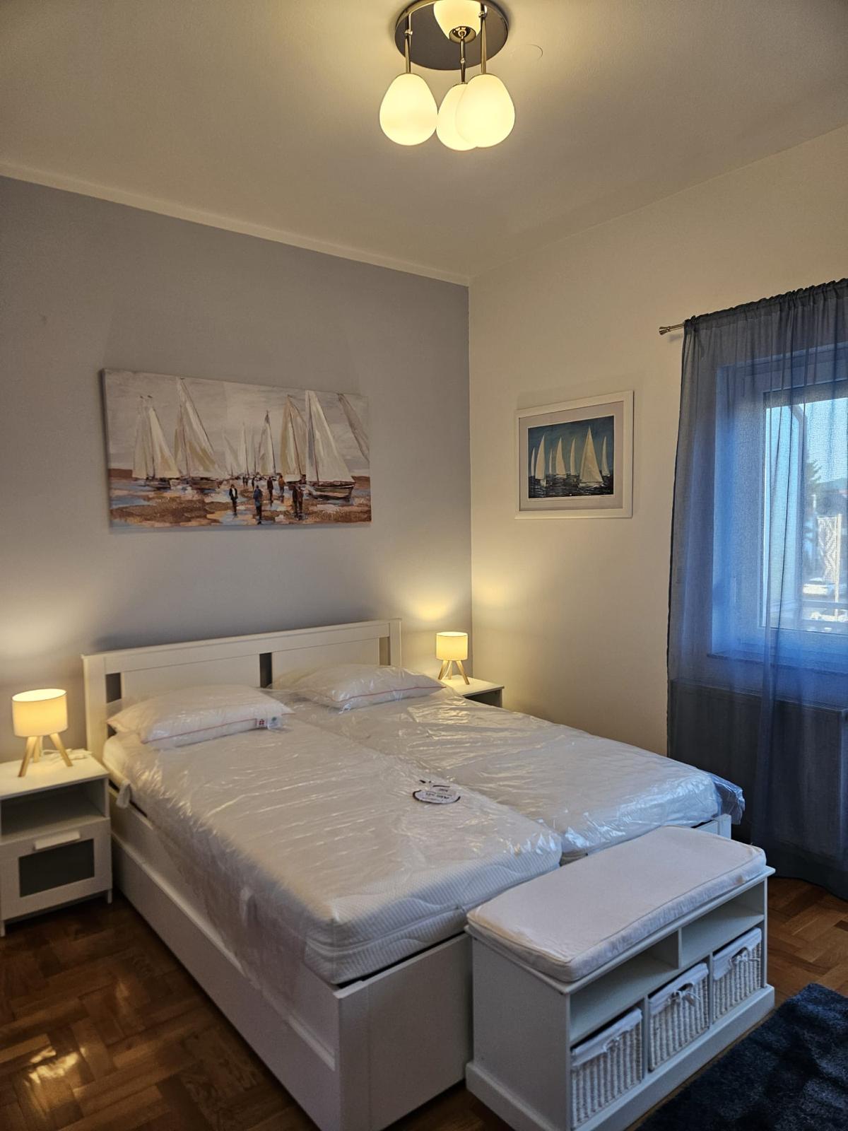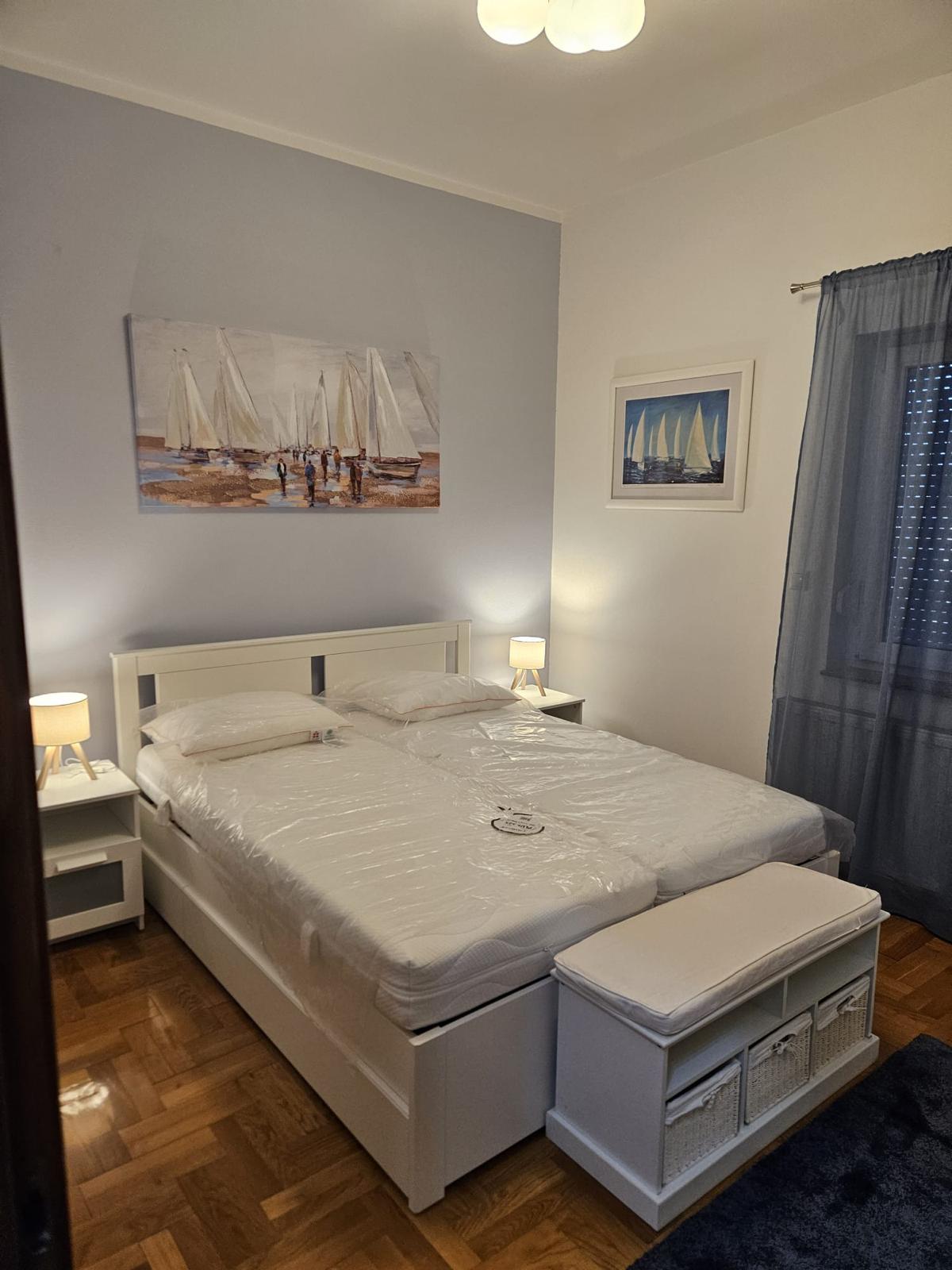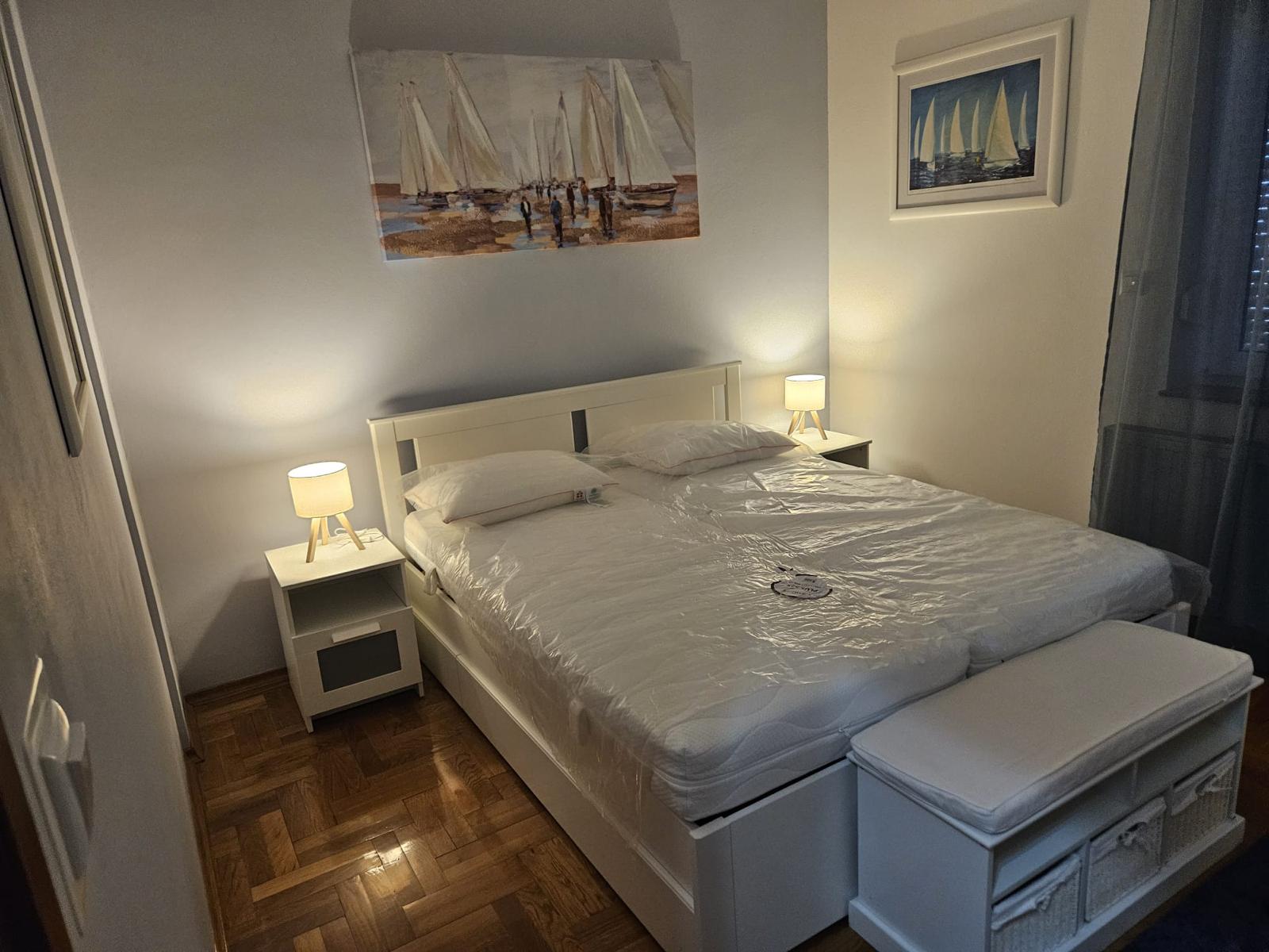 Novi namještaj (bračni krevet 160×200, ormar, trosjed na razvlačenje, stol + 4 stolice), nova rasvjeta, protuprovalna vrata.