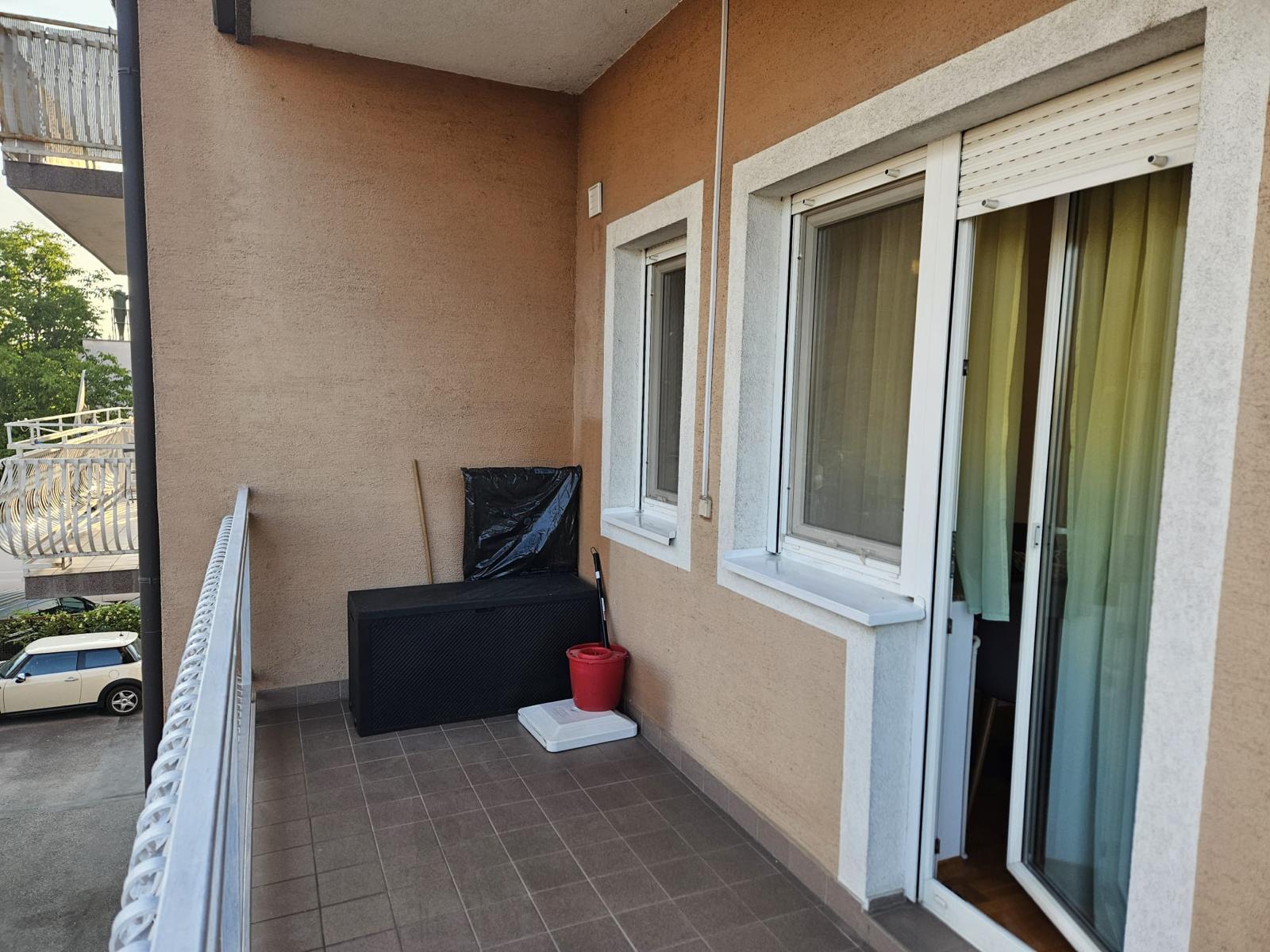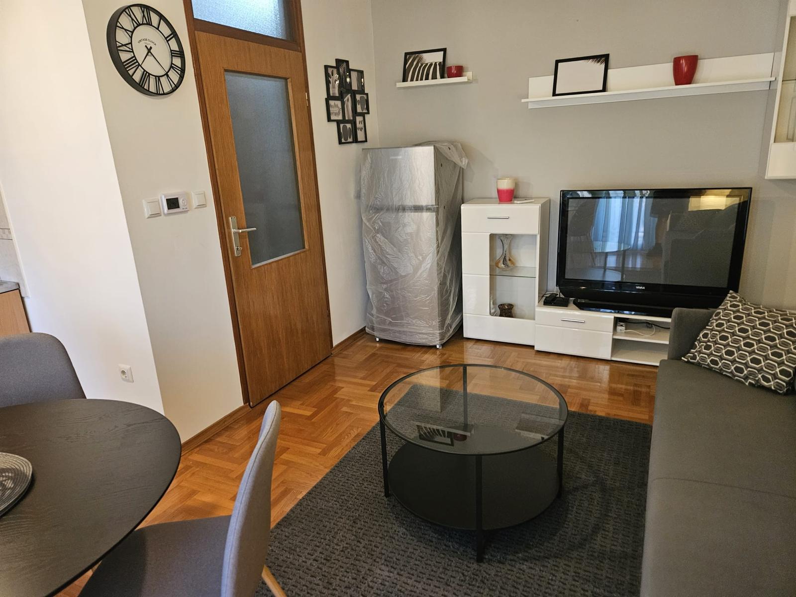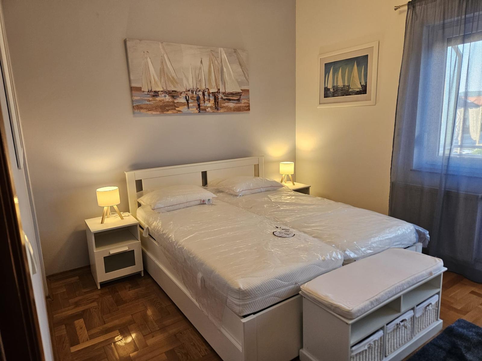 Novi namještaj (bračni krevet 160×200, ormar, trosjed na razvlačenje, stol + 4 stolice), nova rasvjeta, protuprovalna vrata.