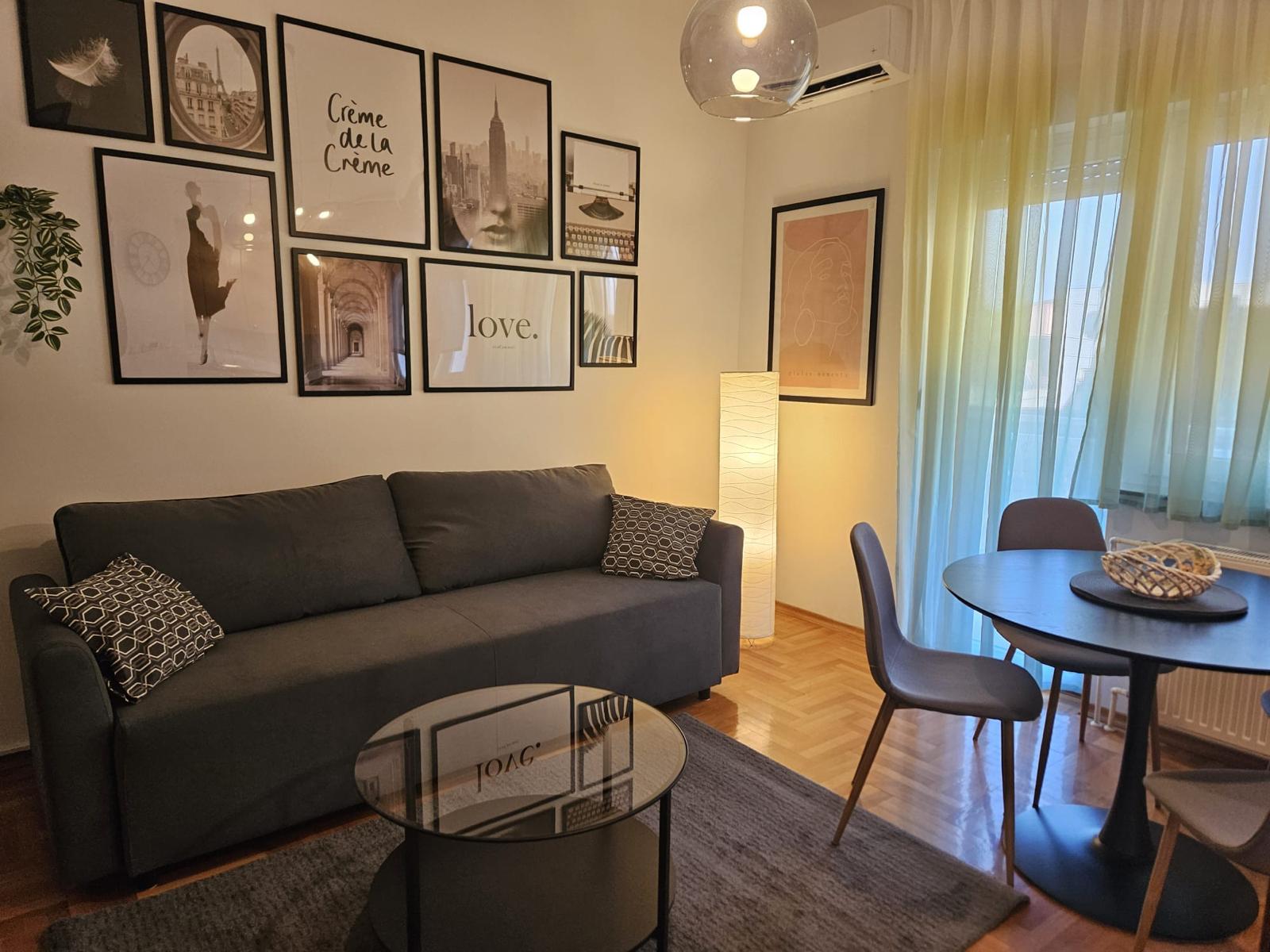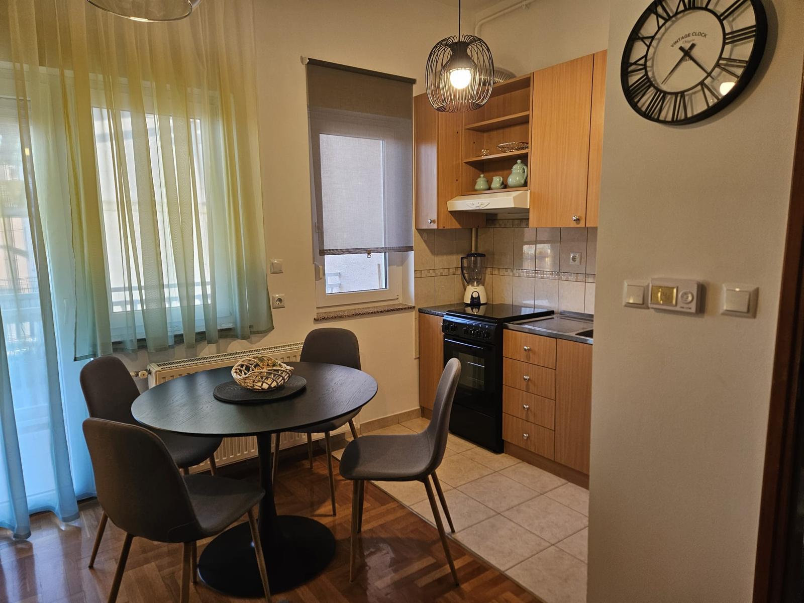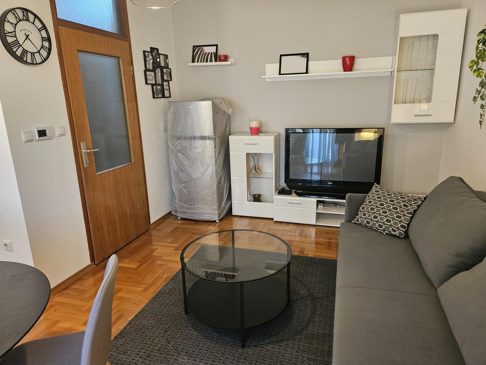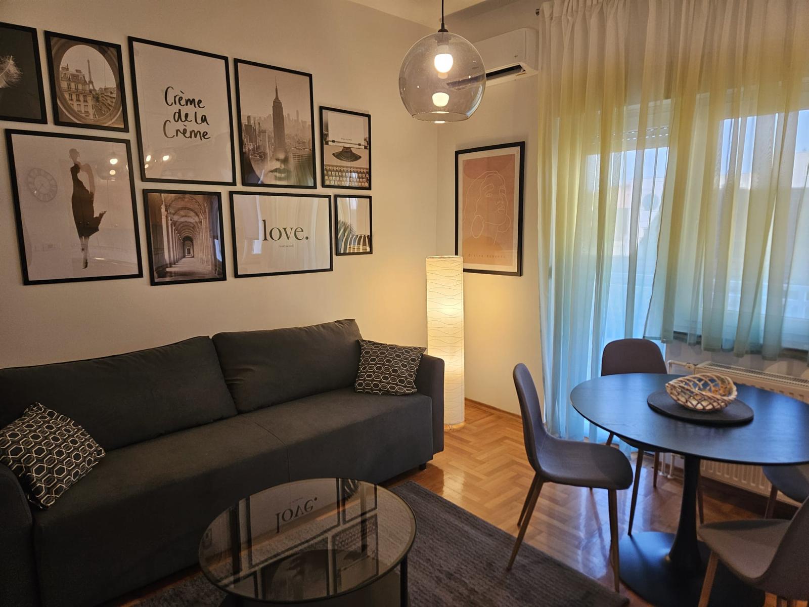 Novi namještaj (bračni krevet 160×200, ormar, trosjed na razvlačenje, stol + 4 stolice), nova rasvjeta, protuprovalna vrata.